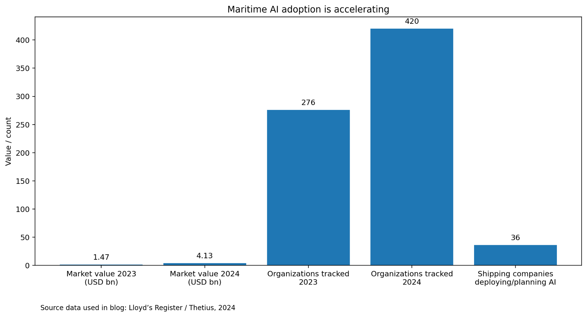 That direction is already visible in the market. Lloyd’s Register, citing Thetius research in 2024, said the maritime AI market had grown from $1.47 billion in 2023 to $4.13 billion, with a projected five-year CAGR of 23%. The same research identified 420 organizations involved in maritime AI and 36 shipping companies that had implemented or planned AI-enabled technologies. In other words, maritime AI is no longer experimental. It is moving into mainstream operational use.