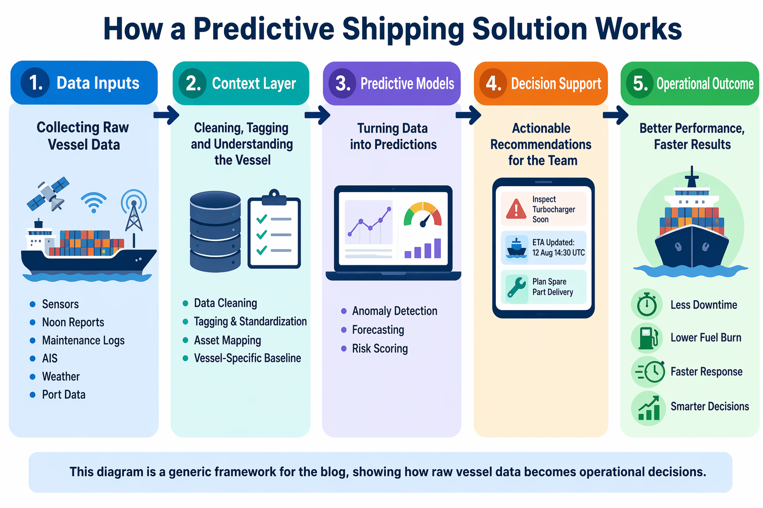 A strong predictive shipping solution works through a chain of operational logic, not just a single model. It starts by collecting inputs such as sensor data, noon reports, maintenance logs, PMS records, alarms, weather, AIS, bunker data, voyage plans, and defect history.