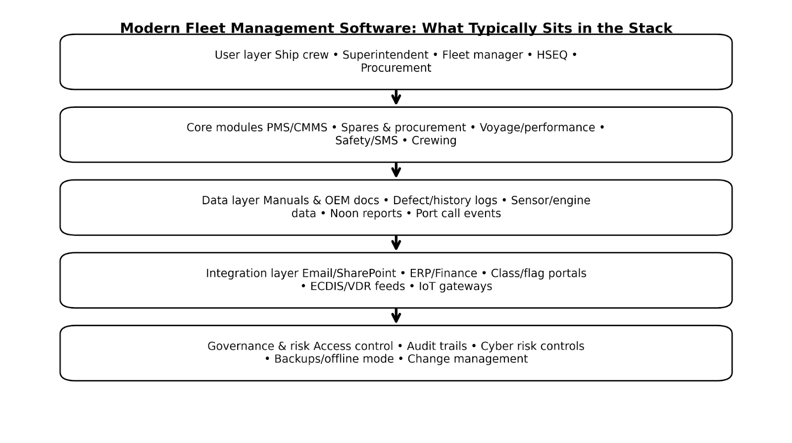 Think of maritime software as a set of connected layers rather than isolated tools.
