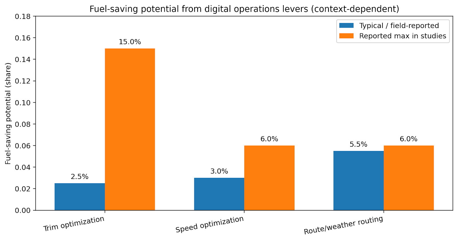 Trim optimization literature reports typical savings in the 2–3% range in fleet operations, with higher savings possible in specific conditions.