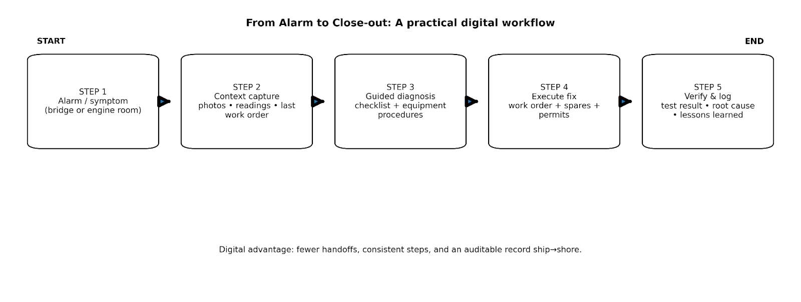 Why it works: maintenance becomes a closed loop: symptom → fix → verify → learn → prevent. PMS systems are built to document planned/unplanned tasks and enable fleet-wide reporting.